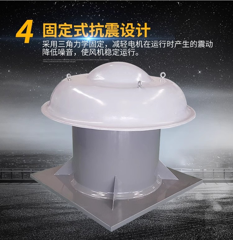 屋頂風機安裝的基礎須高出屋面,表面要求平整,以防滲水漏水,并須預埋好地腳螺栓。2、風機底座與基礎之間加墊一層5mm橡膠板,以減少振動,地腳螺栓應配有彈簧墊圈,防止使用時松動。3、屋頂風機出口的管徑只能變大、不能變小,后出風口要安裝防蟲網,偏向上出風時須增加風雨帽;如遇冬季下雪,冰凍日期,必須經常開動,以防大雪堵塞風機出口。4、屋頂風機與風管采用軟管(柔性材料且不燃燒)連接,長度不宜小于200mm、管徑與屋頂風機進出口尺寸相同。為保證軟管在系統運轉過程中不出現扭曲變形,應安裝的松緊適度。對于裝在屋頂風機吸入端的帆布軟管,可安裝稍緊些,防止屋頂風機運轉時被吸入,減少帆布軟管的截面尺寸。