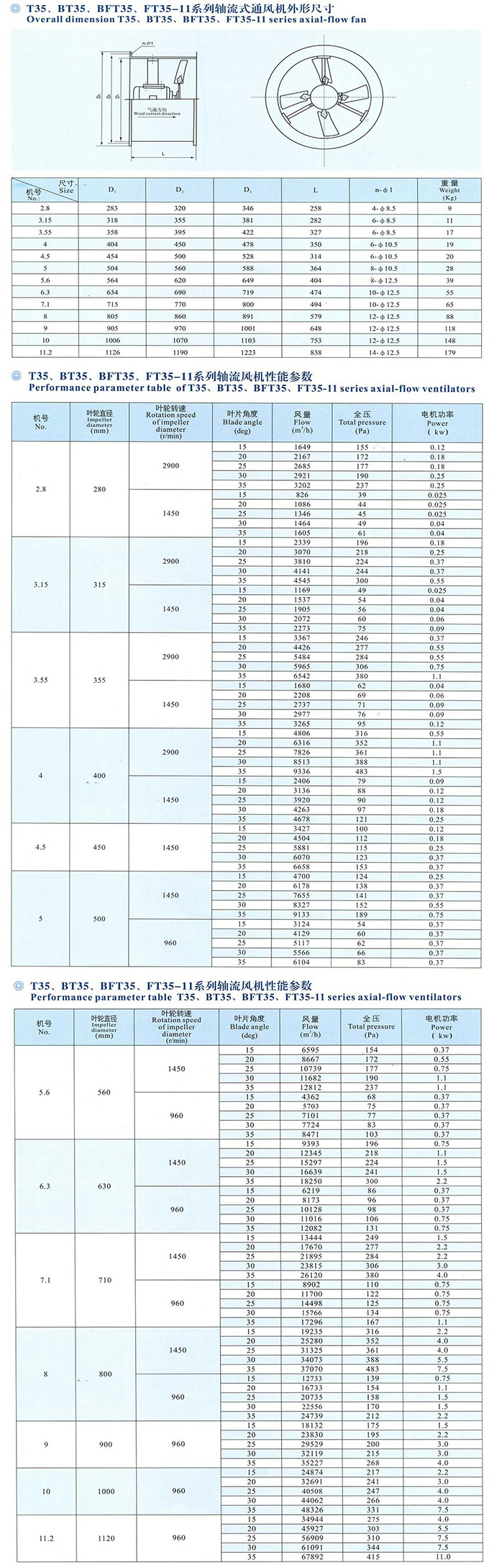 T35型軸流風(fēng)機(jī)按葉輪直徑共分為13個(gè)機(jī)號(hào),依次排列為:№2.8、3.15、3.55、4、4.5、5、5.6、6.3、7.1、8、9、10、11.2。軸流風(fēng)機(jī)每一個(gè)機(jī)號(hào)又分為15°、20°、25°、30°、35°等5種葉片安裝角度。各機(jī)號(hào)均采用葉輪與電動(dòng)機(jī)直連結(jié)構(gòu)。軸流風(fēng)機(jī)在葉輪圓周速度不超過60m/s條件下,配用3種轉(zhuǎn)速:2900、1450、960r/min,進(jìn)氣方向在軸流風(fēng)機(jī)的葉輪一側(cè)。